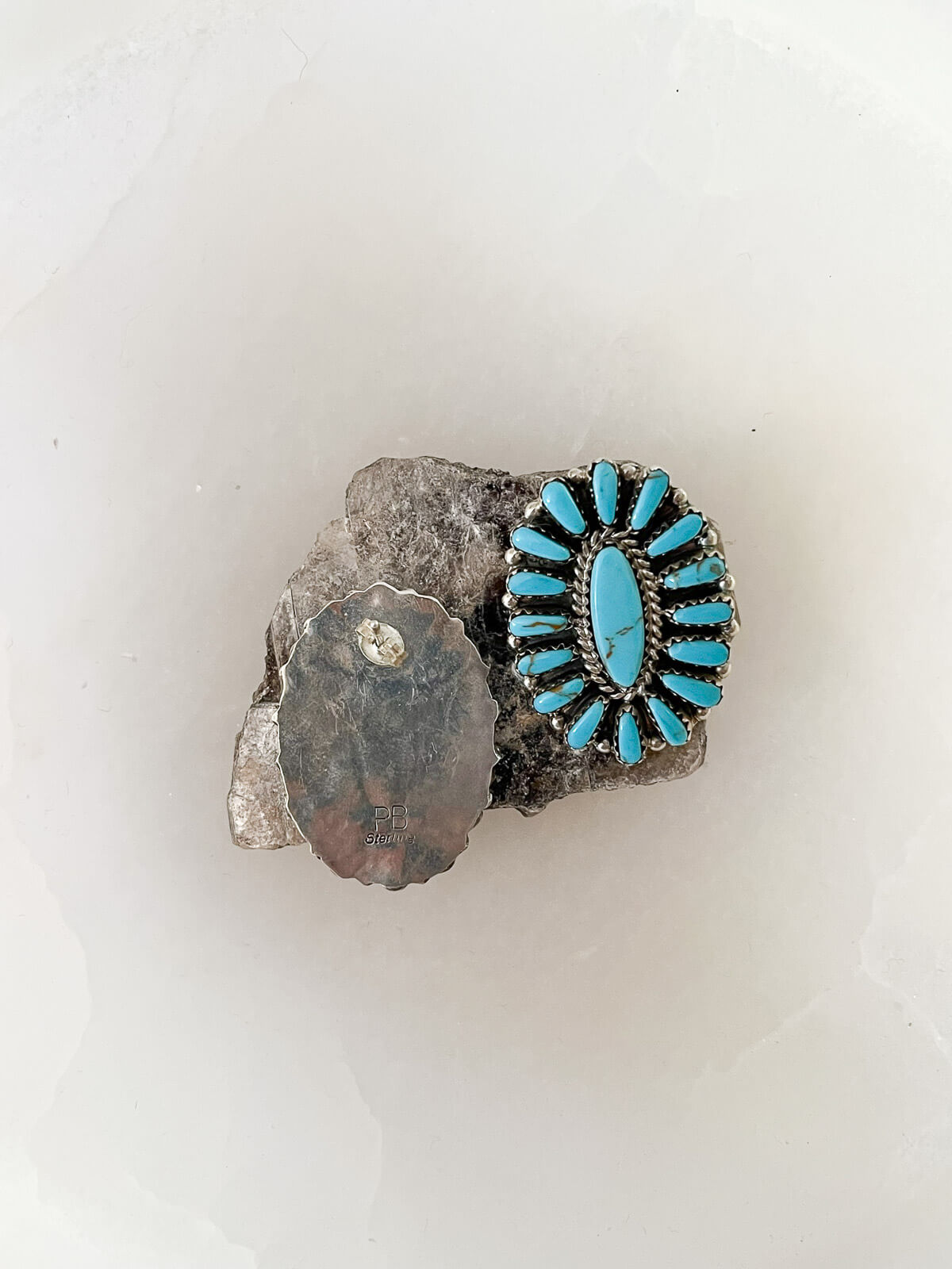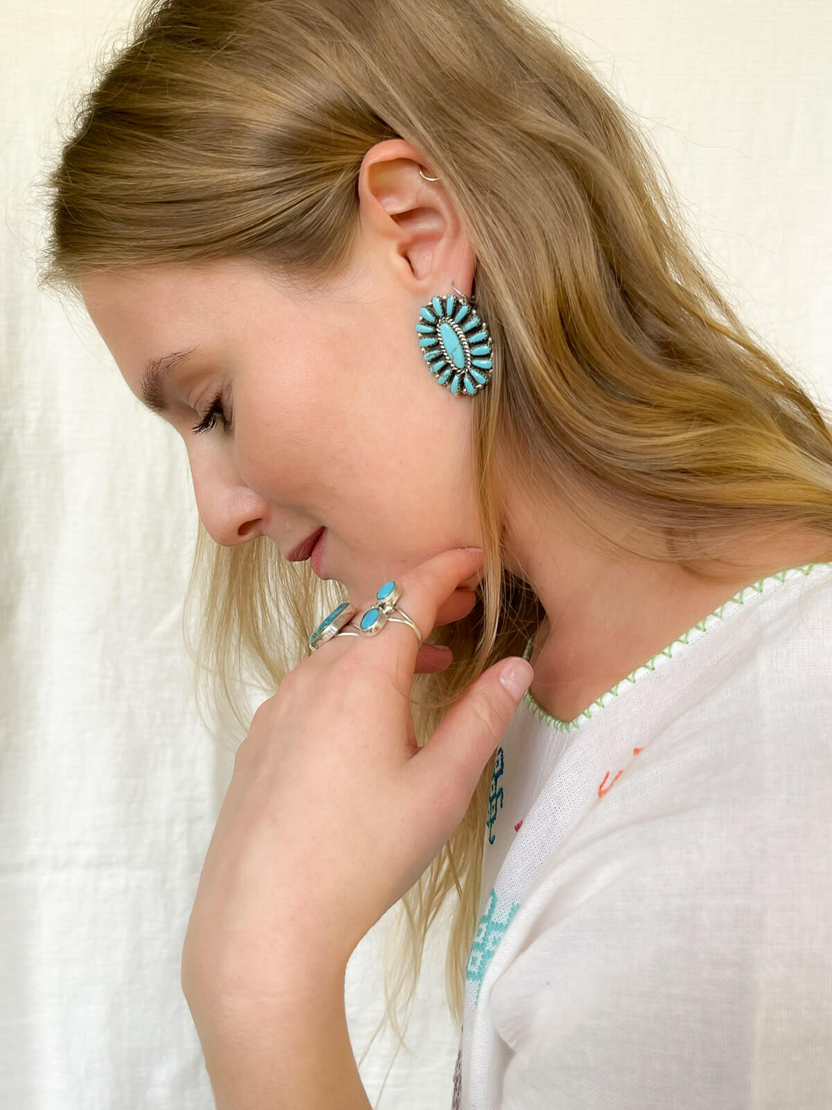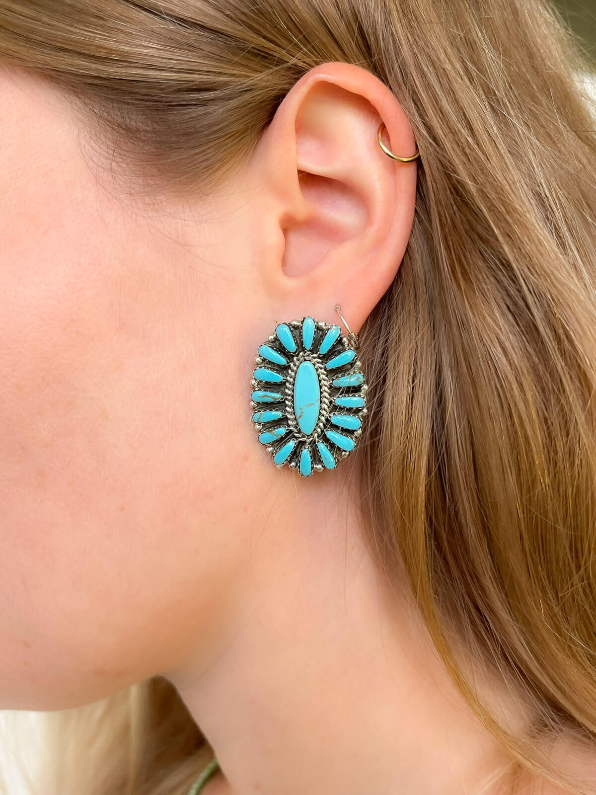 Diese filigranen, einzigartigen Türkisohrringe werden von einem Zuni-Silberschmied sorgfältig handgefertigt. Jeder Ohrring besteht aus sechzehn kleinen, länglichen Türkisen, die in der Mitte mit einem großen ovalen Türkis verziert sind. Dieses besondere Paar Vintage-Ohrringe ist ein herausragendes Statement-Stück, sorgfältig gefertigt aus 925er Sterlingsilber.