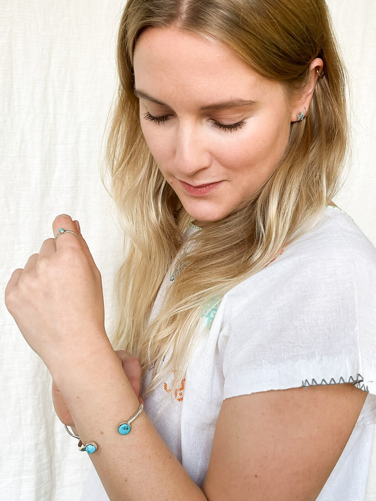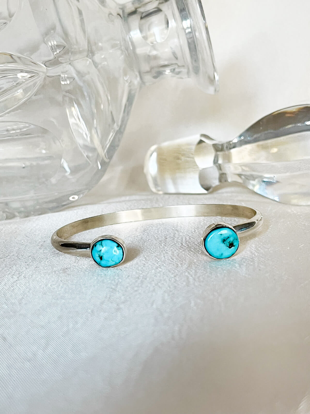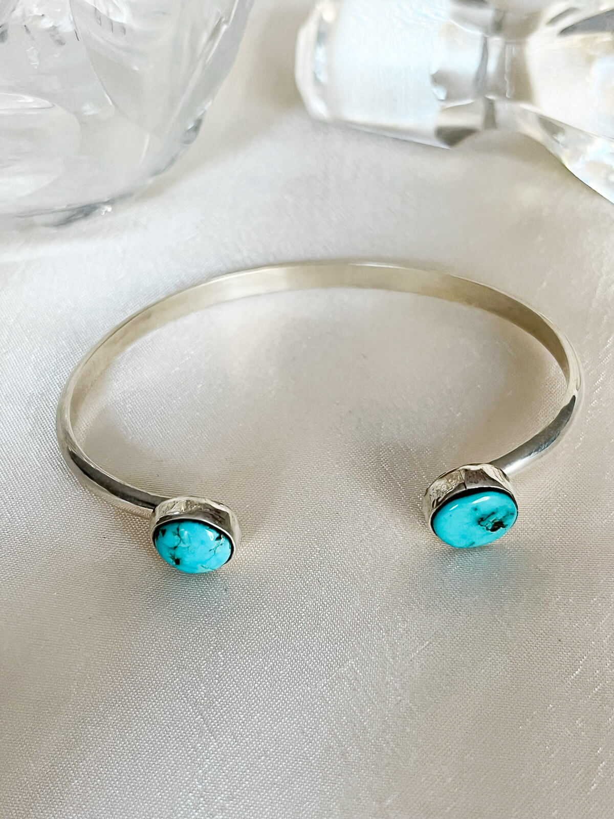 Der KOKO Türkis-Armreif besticht durch zwei frei formbare, intensiv blaue Türkis-Steine an der Oberseite. Dieses moderne und zeitlose Schmuckstück wird in den USA aus massivem 925er Sterlingsilber gefertigt und ist als flexibler Armreif konzipiert, der sich leicht an Ihr Handgelenk anpassen lässt.