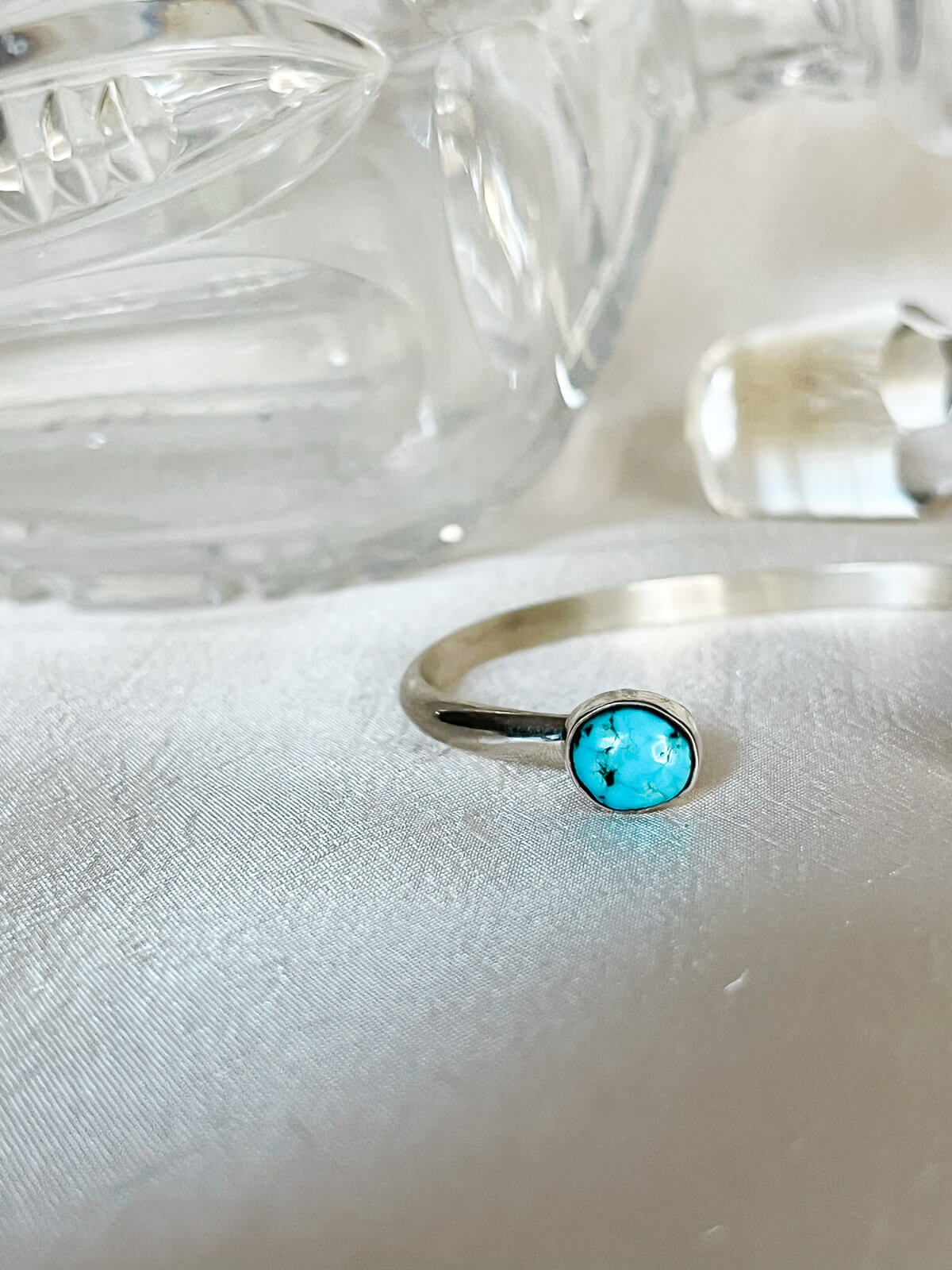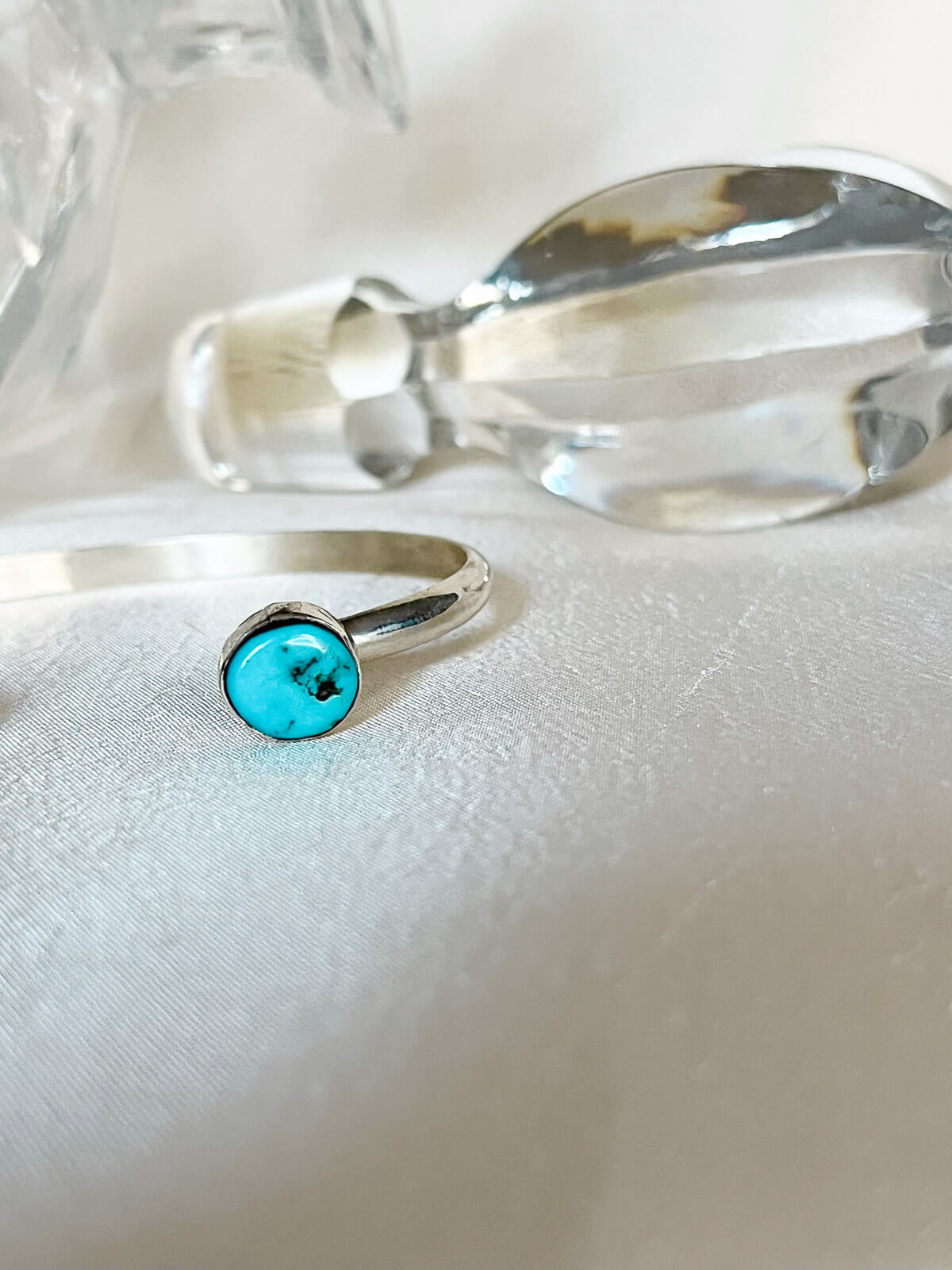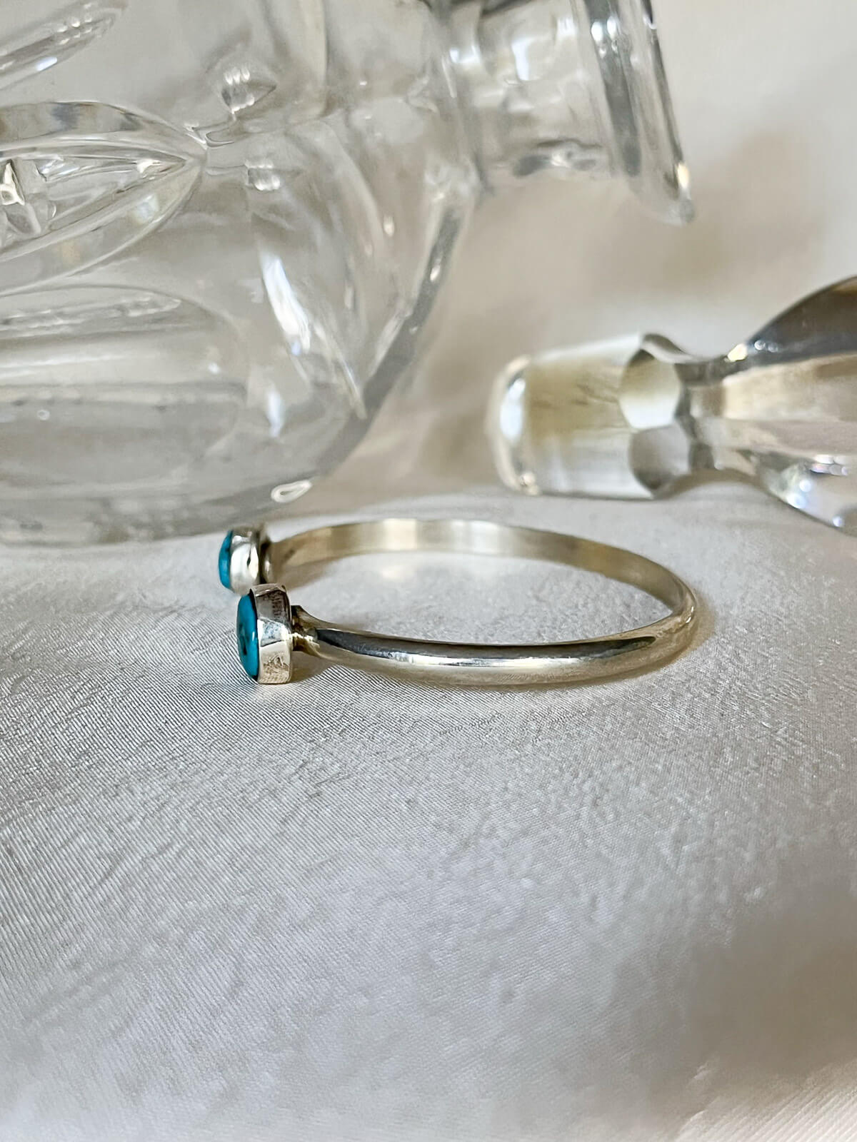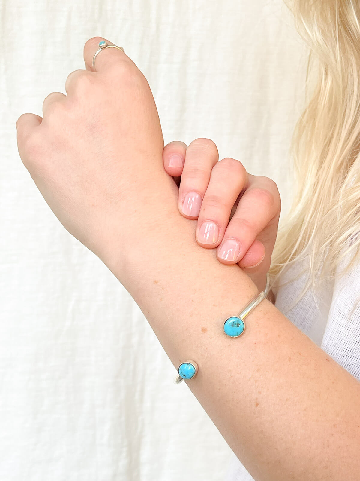 Der KOKO Türkis-Armreif besticht durch zwei frei formbare, intensiv blaue Türkis-Steine an der Oberseite. Dieses moderne und zeitlose Schmuckstück wird in den USA aus massivem 925er Sterlingsilber gefertigt und ist als flexibler Armreif konzipiert, der sich leicht an Ihr Handgelenk anpassen lässt.