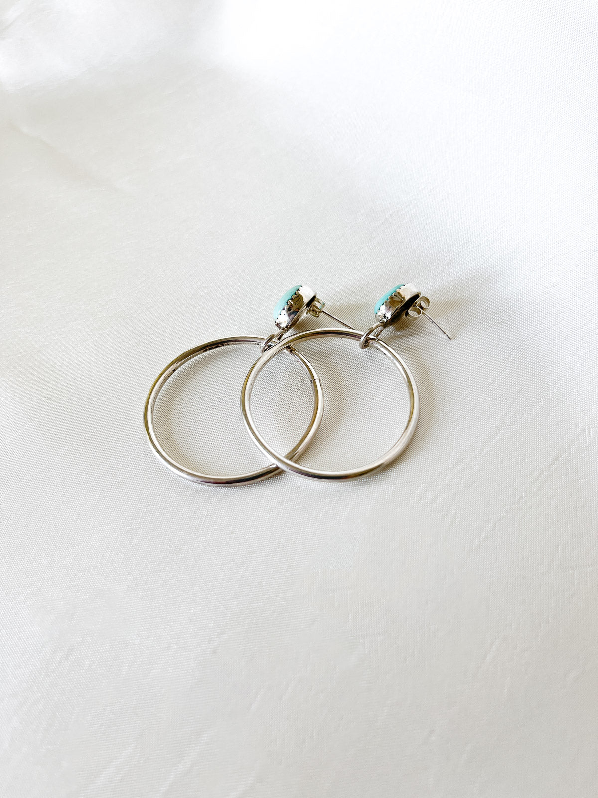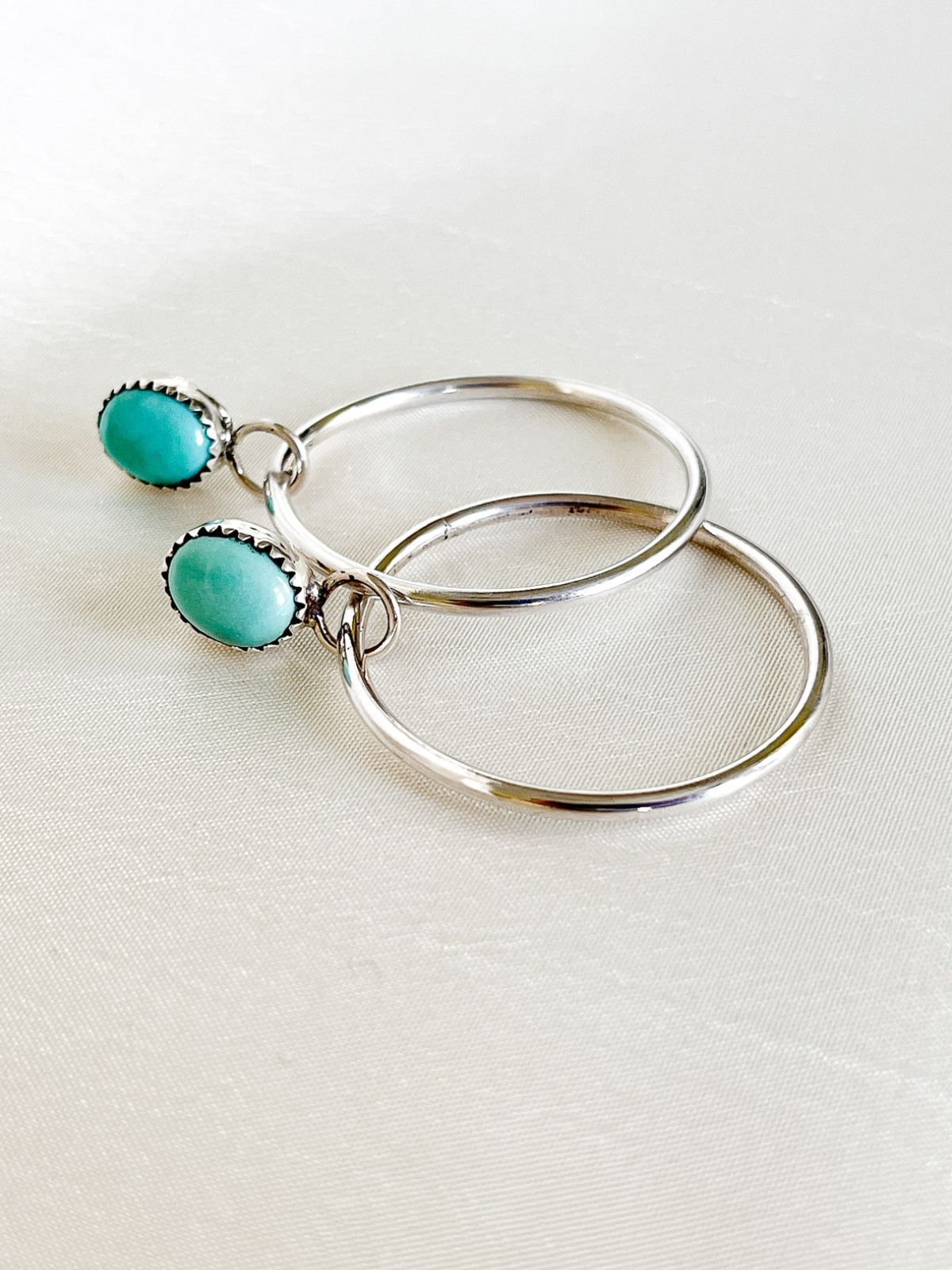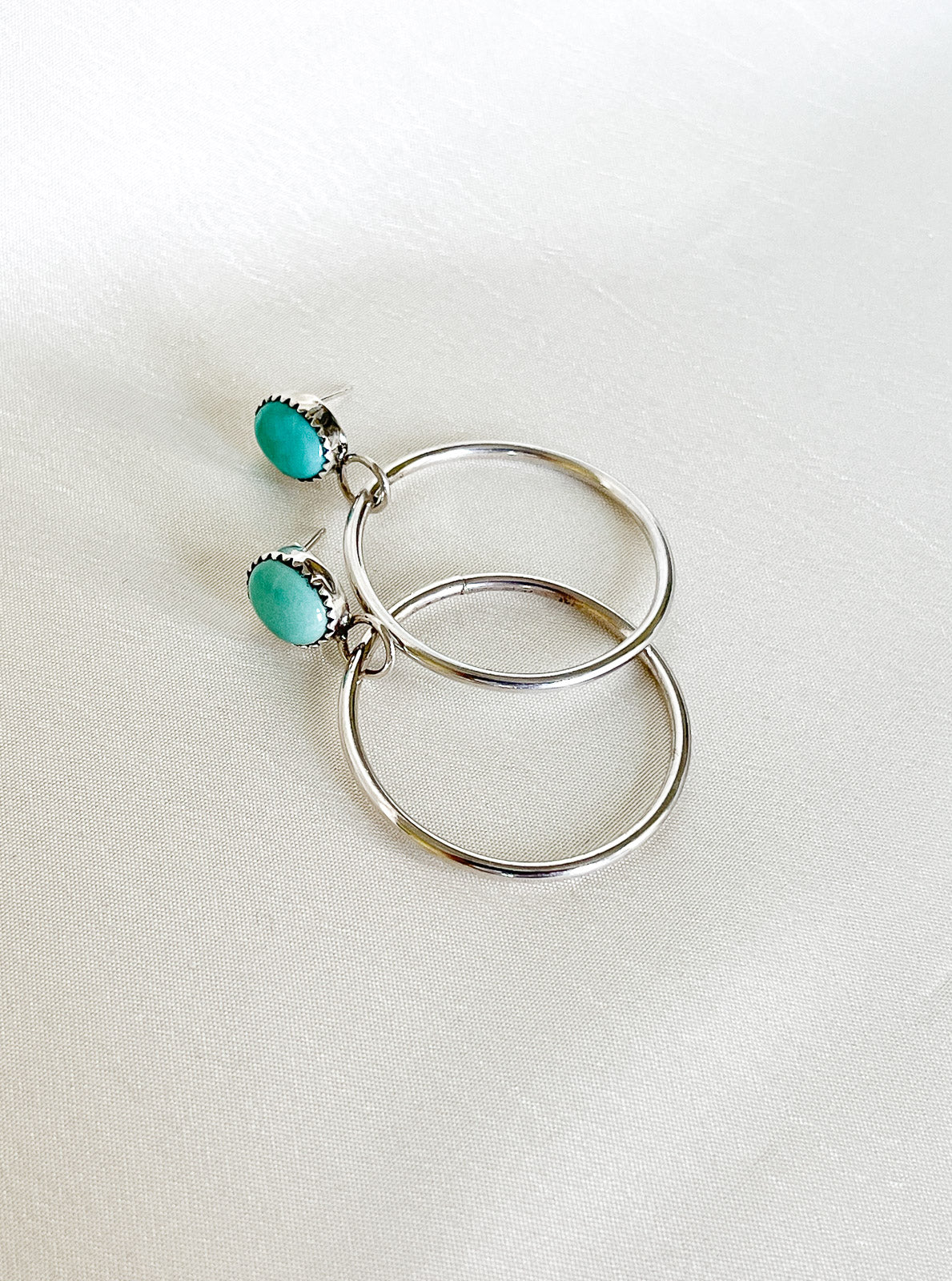 Die MAI Creolen sind aus hellblauen, ovalen Türkisen gefertigt. Gefertigt aus unserem kleinen, massiven Creolendraht ergeben sie ein filigranes Statement-Stück. Der frei fließende Draht ist in die Öse eingearbeitet und verleiht ihnen einen schmeichelhaften, lässigen Look. Jedes Paar unserer Creolen wird vom Navajo-Silberschmied Anthony (USA) komplett handgefertigt und besteht aus 925er Sterlingsilber.