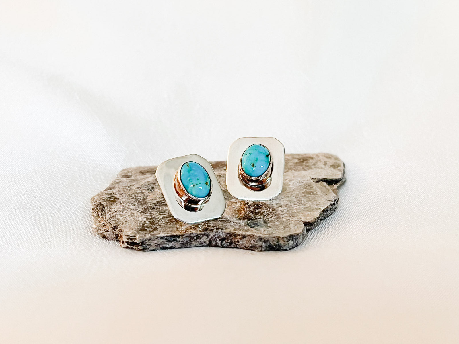 Die ELU Vintage-Ohrstecker bestehen aus intensiv blauen, ovalen Türkisen, eingefasst in 925er Sterlingsilber. Dieses Paar Türkis-Ohrstecker wurde von einem Navajo-Silberschmied in New Mexico (USA) gefertigt.