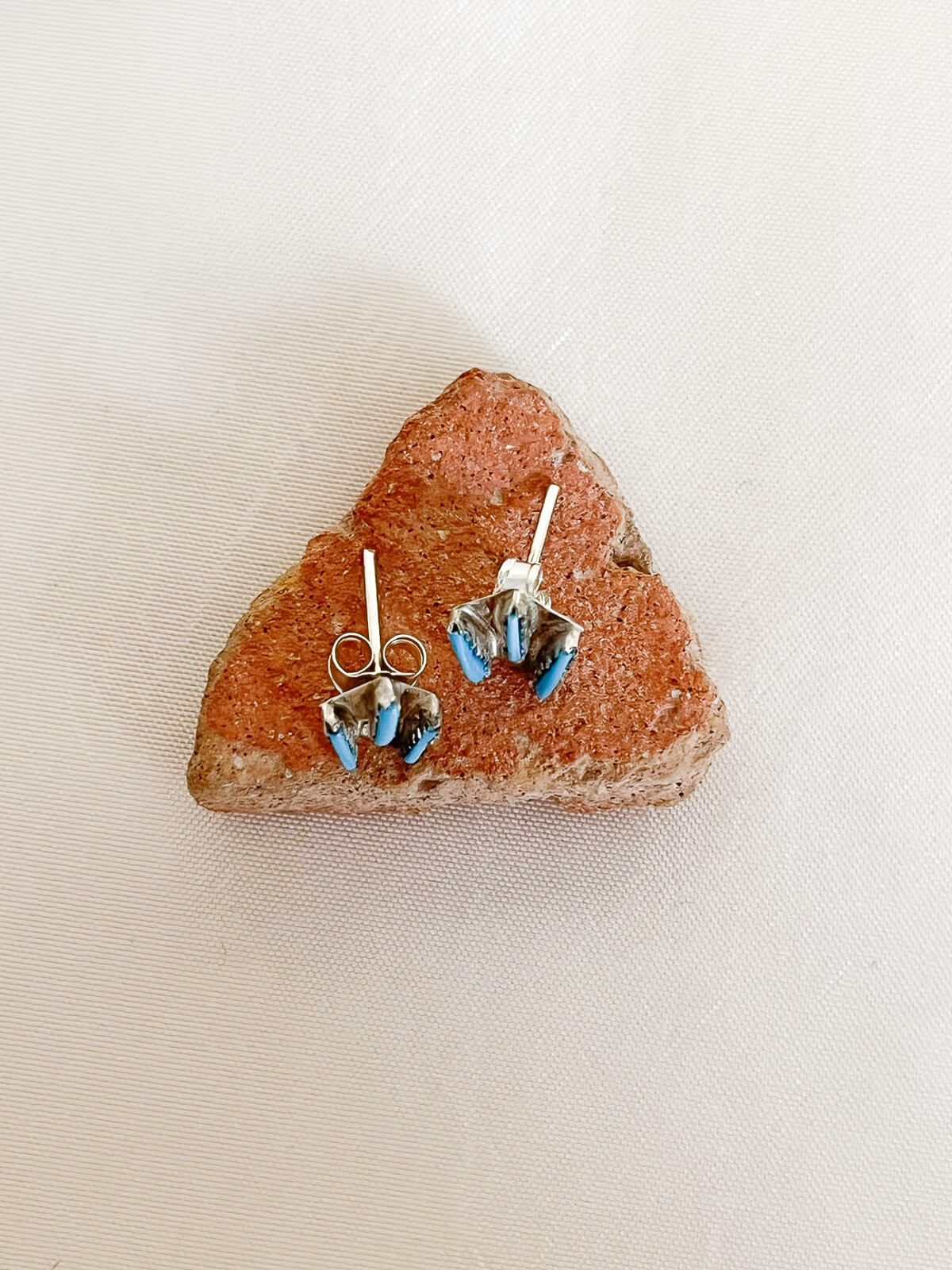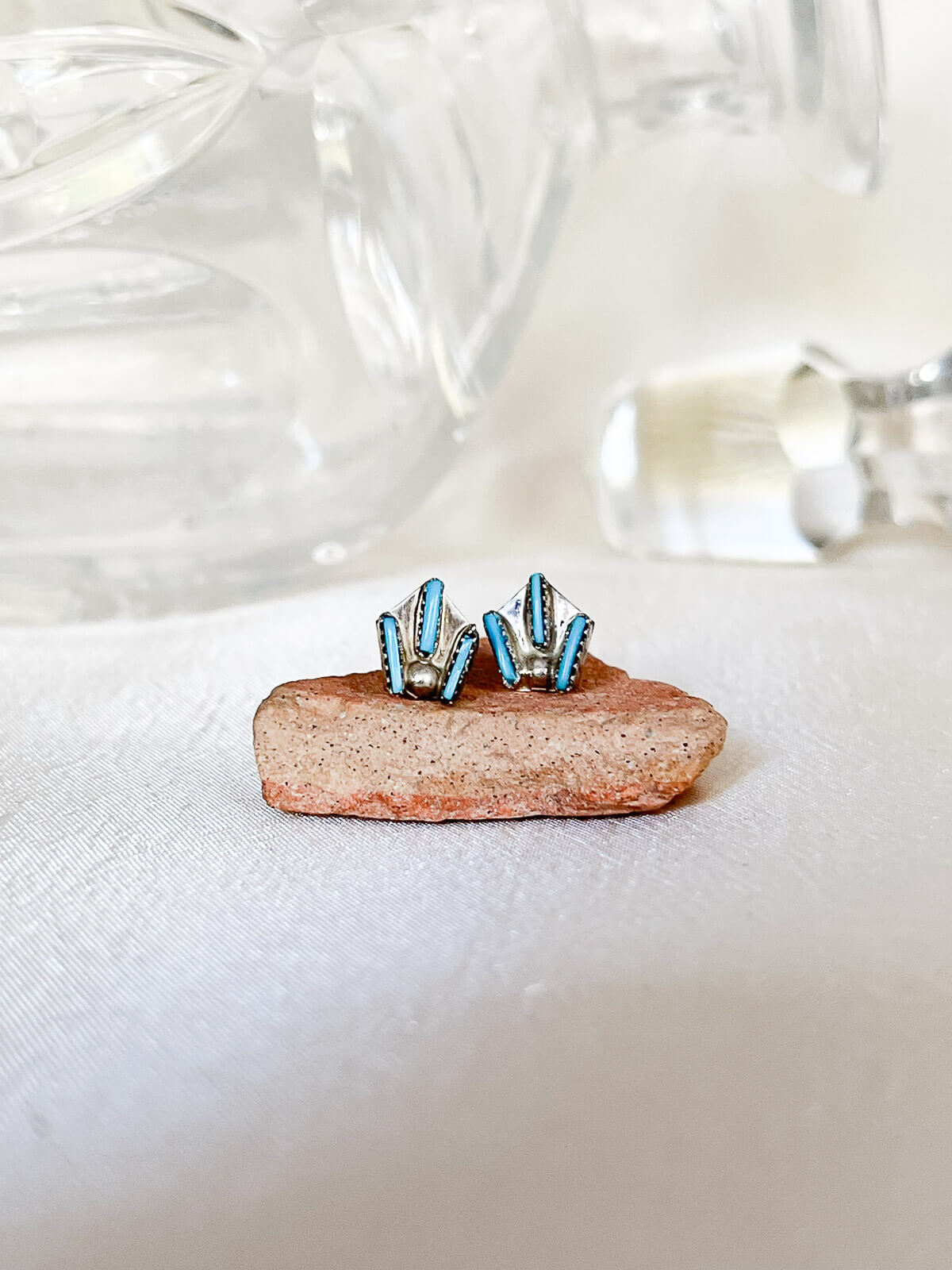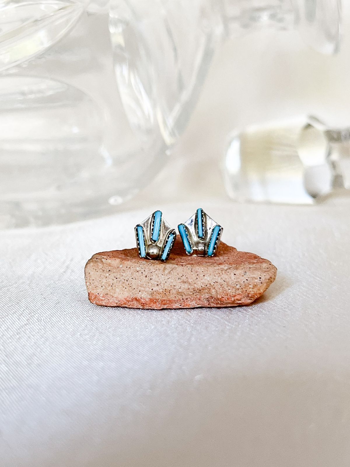 Die Vintage-Ohrstecker NALA bestehen aus winzigen blauen, länglichen Türkisen, eingefasst in 925er Sterlingsilber. Dieses Paar türkisfarbener Ohrstecker wurde von einem Zuni-Silberschmied in New Mexico (USA) gefertigt.