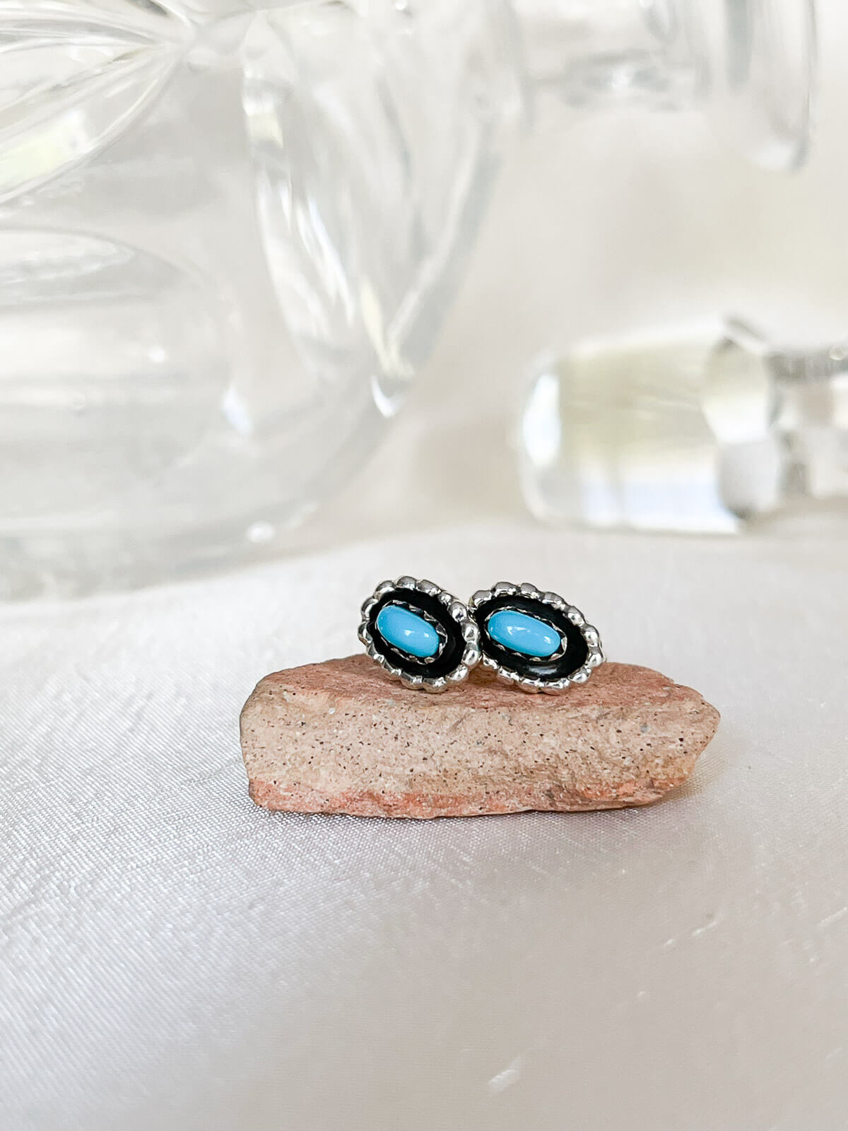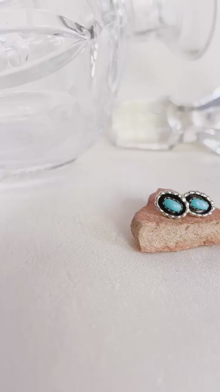 Die Vintage-Ohrstecker SHILAH bestehen aus ovalen Türkisen, die mit einem leicht geflochtenen Draht verziert sind. Dieses Paar Türkis-Ohrstecker aus 925er Sterlingsilber wurde von einem Navajo-Silberschmied in New Mexico (USA) gefertigt.