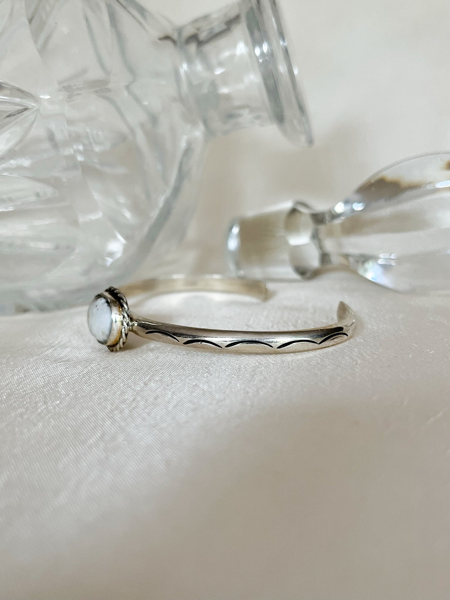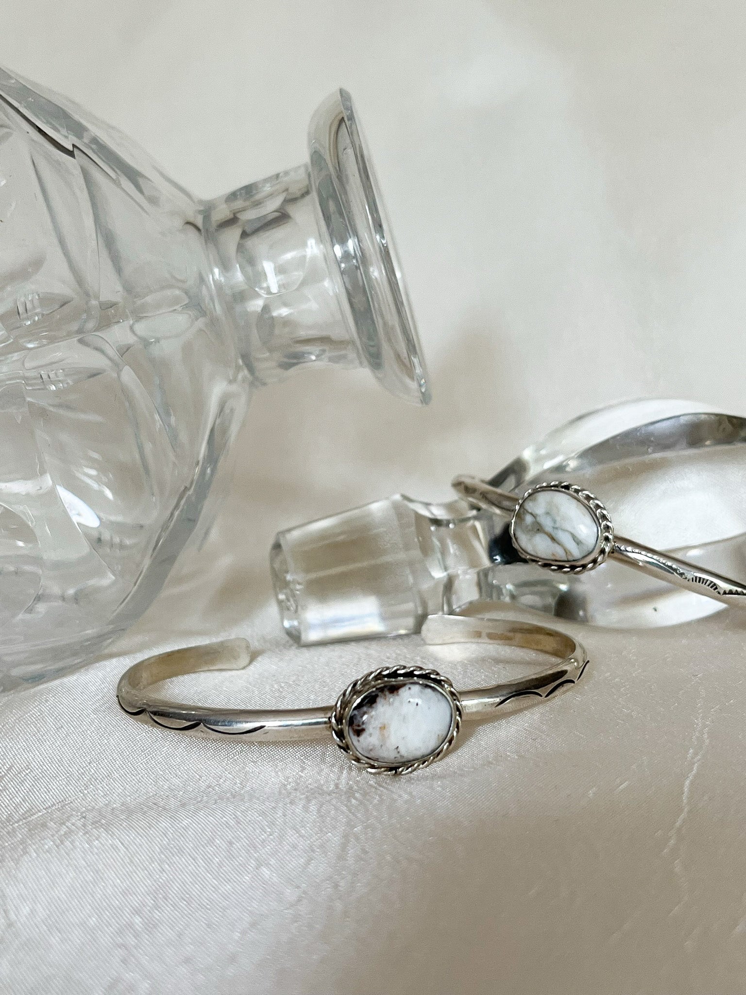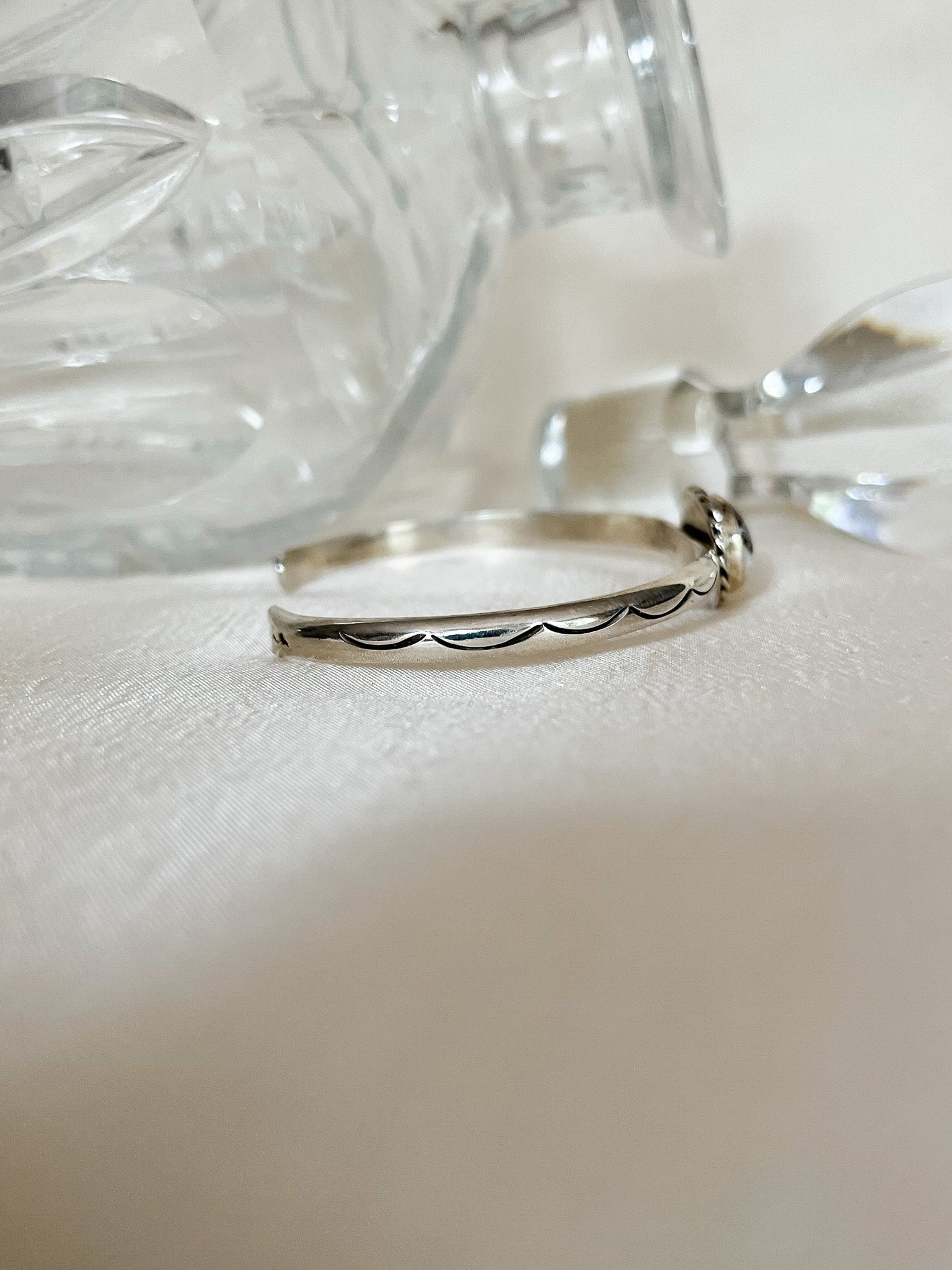 Dieser Armreif aus weißem Büffelleder wurde sorgfältig vom Navajo-Silberschmied Anthony gefertigt. Er besteht aus 925er Sterlingsilber und ist flexibel gestaltet, sodass er sich leicht an Ihr Handgelenk anpassen lässt.