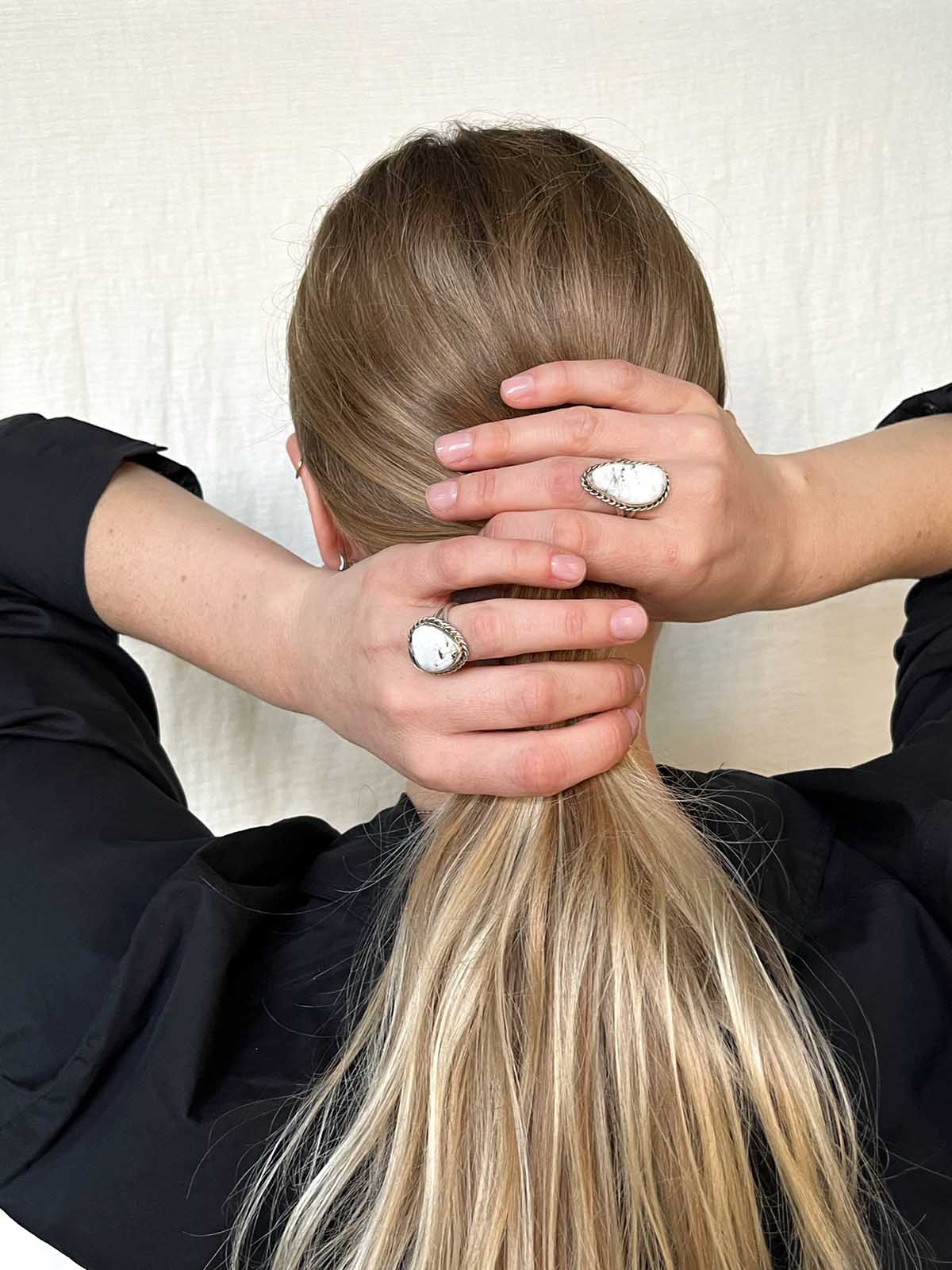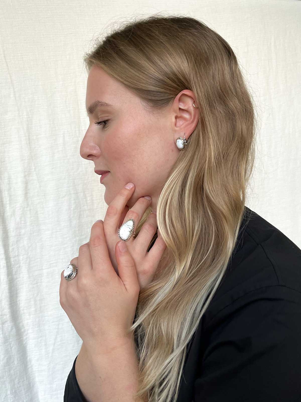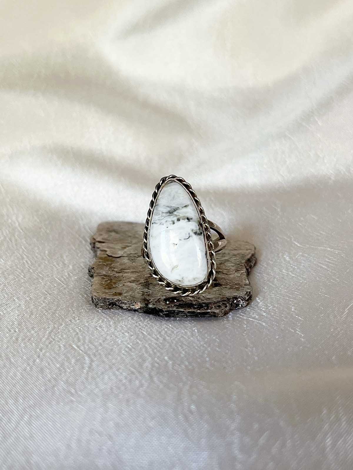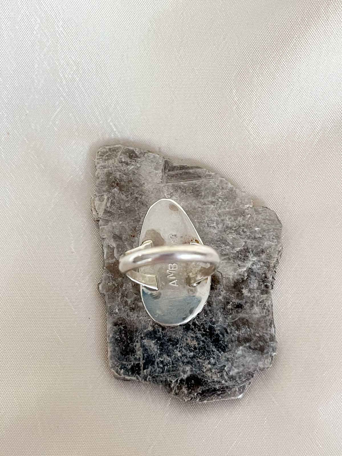 Der ONACONA Statement-Ring ziert einen leuchtenden, einzigartig geformten Weißen Büffelstein. Handgefertigt aus 925er Sterlingsilber vom Navajo-Silberschmied Anthony in den USA, vereint dieser Ring kunstvolle Handwerkskunst mit der Schönheit des seltenen Weißen Büffels , der traditionell für seine schützenden und stärkenden Eigenschaften bekannt ist.