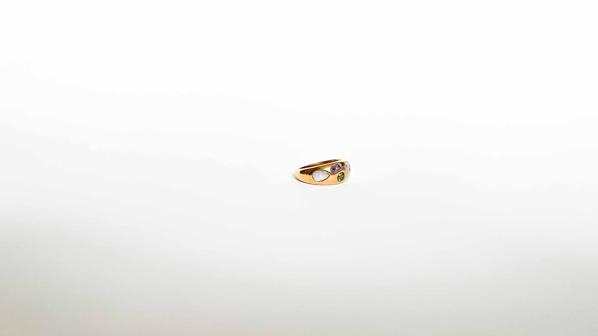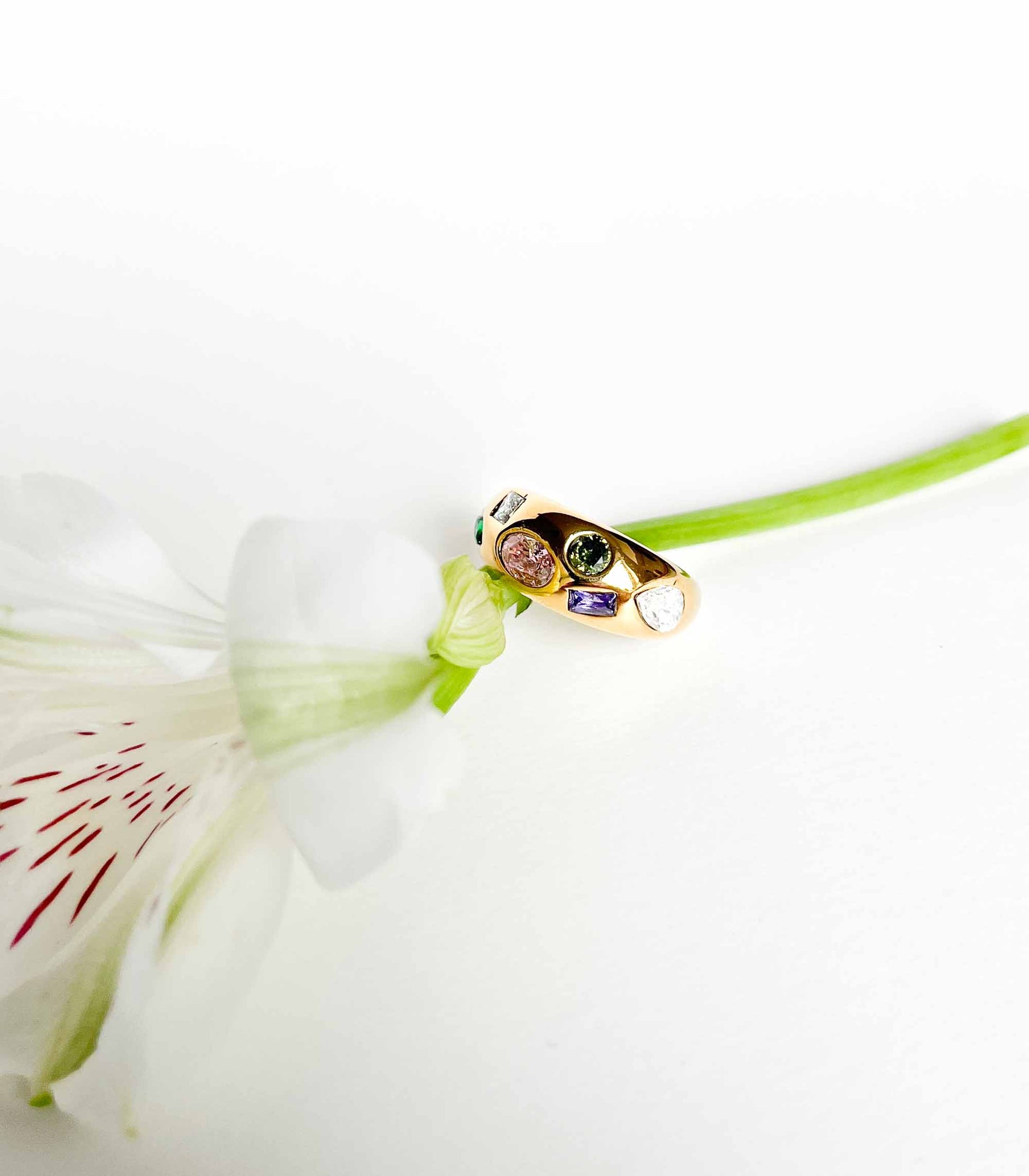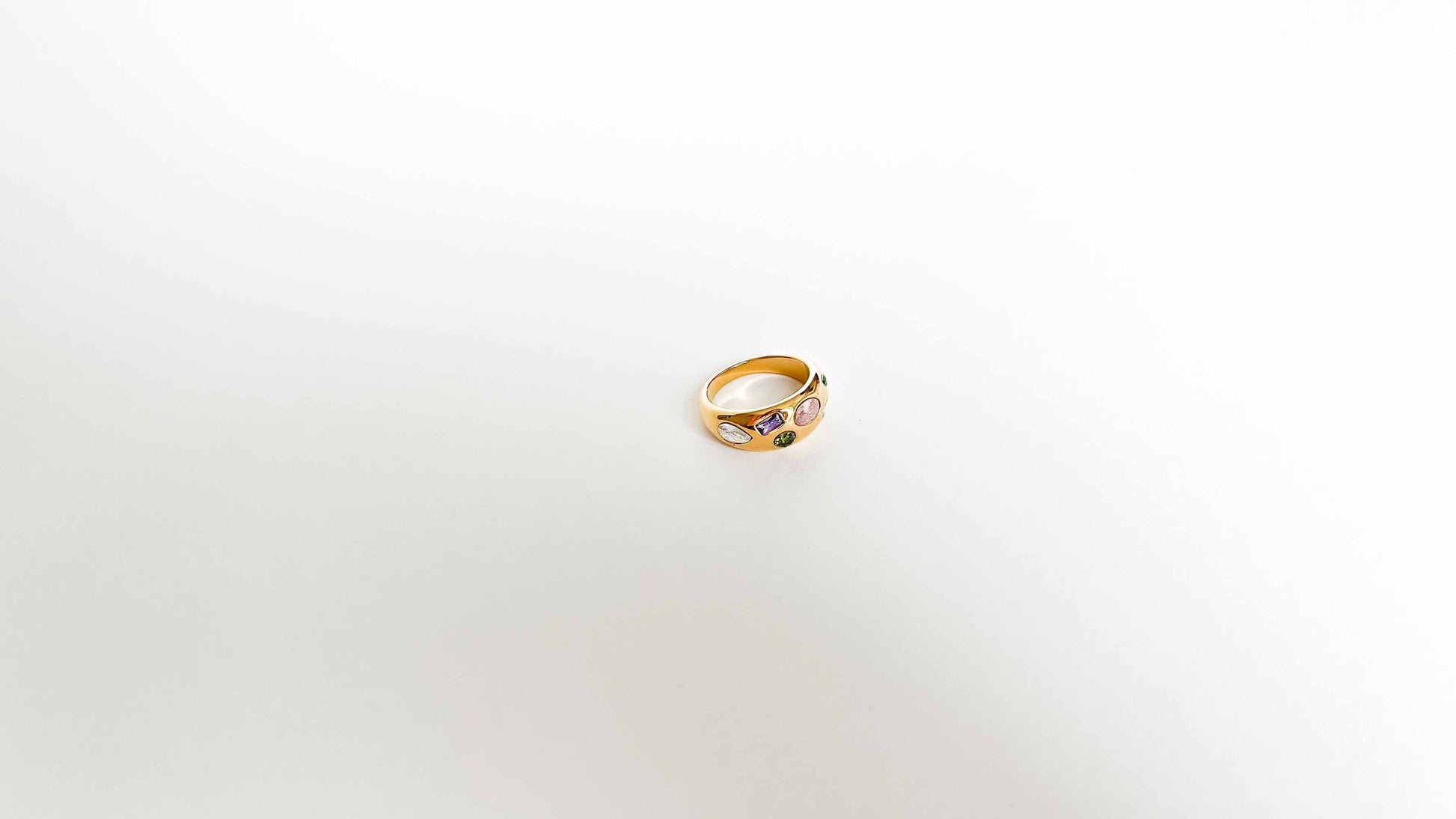 Our elegant golden ring PUGLIA features colorful cubic zirconia stones set in a sturdy yet refined 18k gold-plated stainless steel band. Designed for versatility, this ring is perfect for stacking with other styles or wearing solo for a sophisticated, everyday look.
