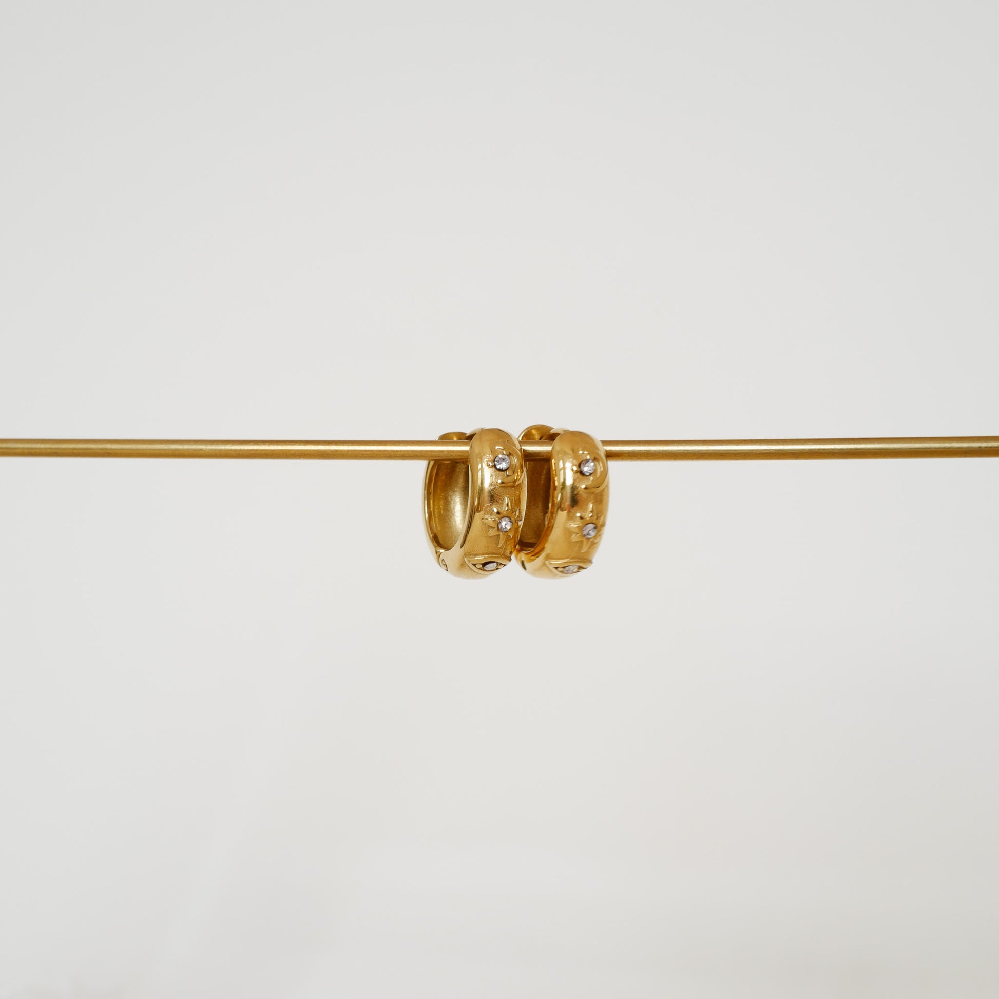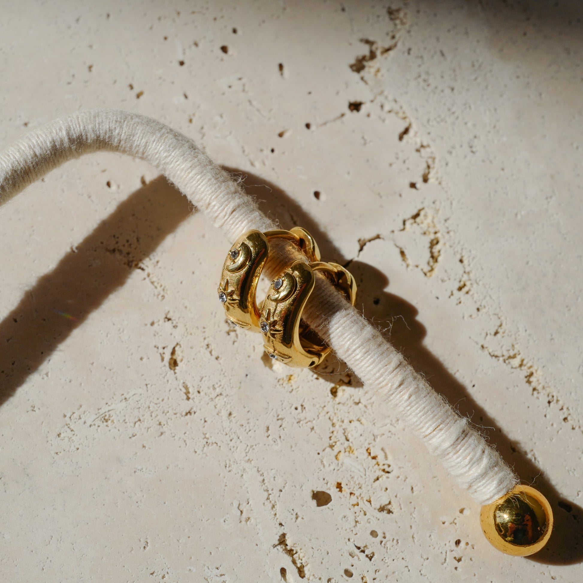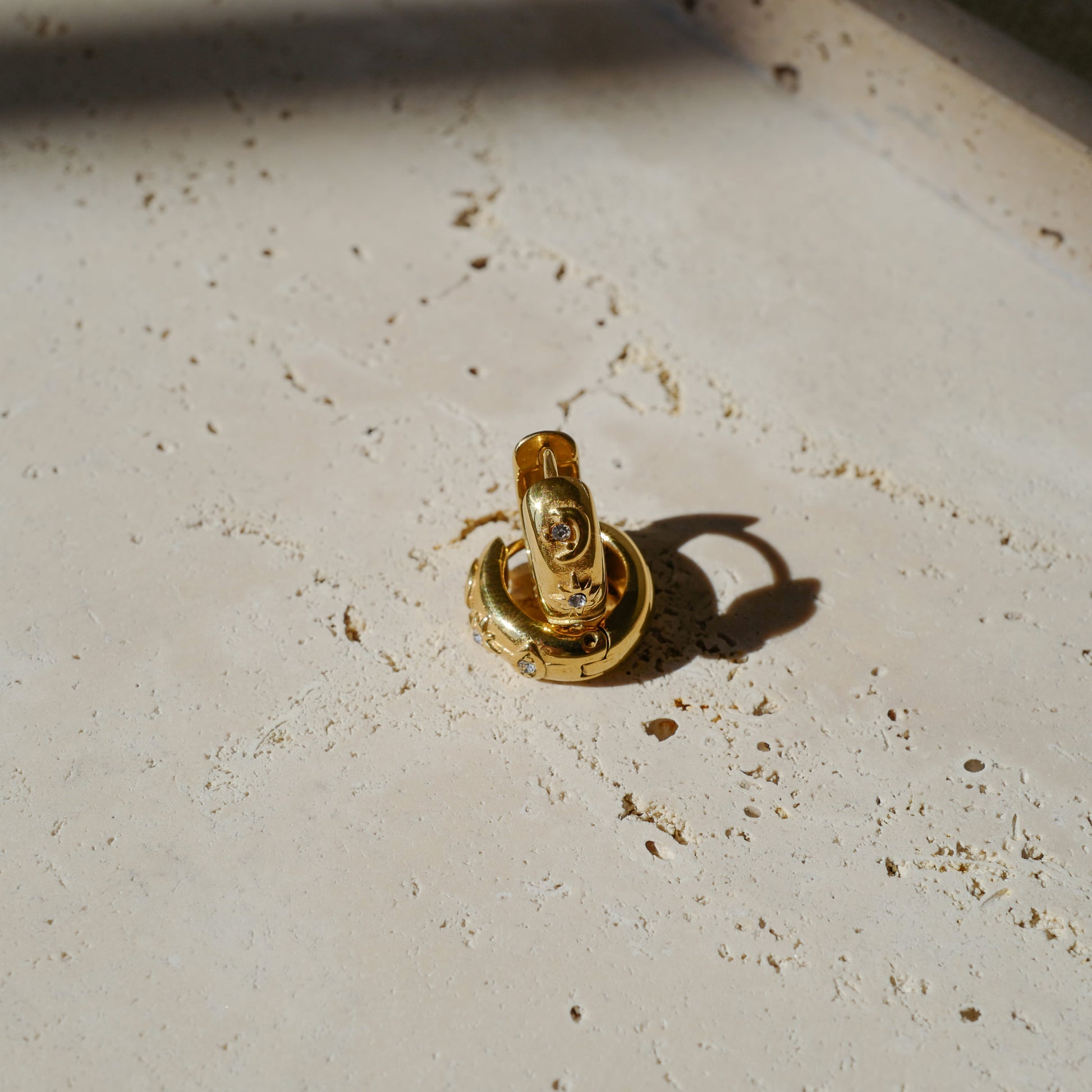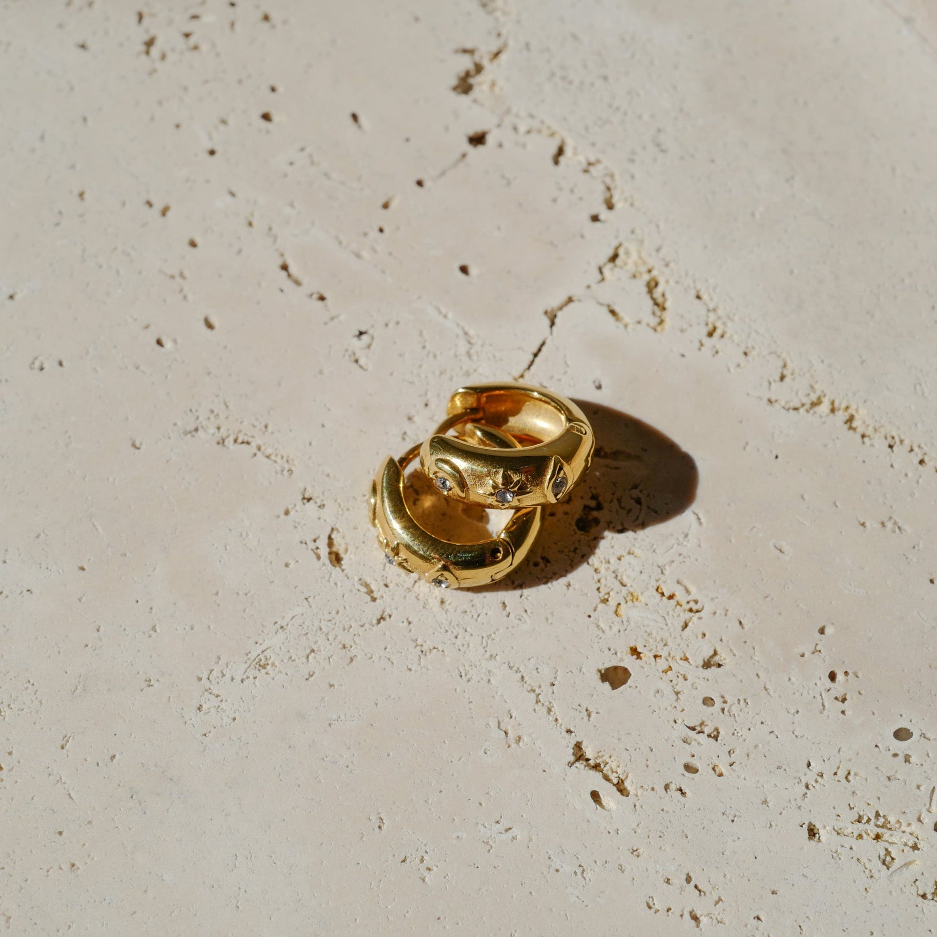 Our chunky SOL hoops in gold showcase a semi-matte finish, beautifully decorated with tiny cubic zirconias set within intricate sun and eye designs.