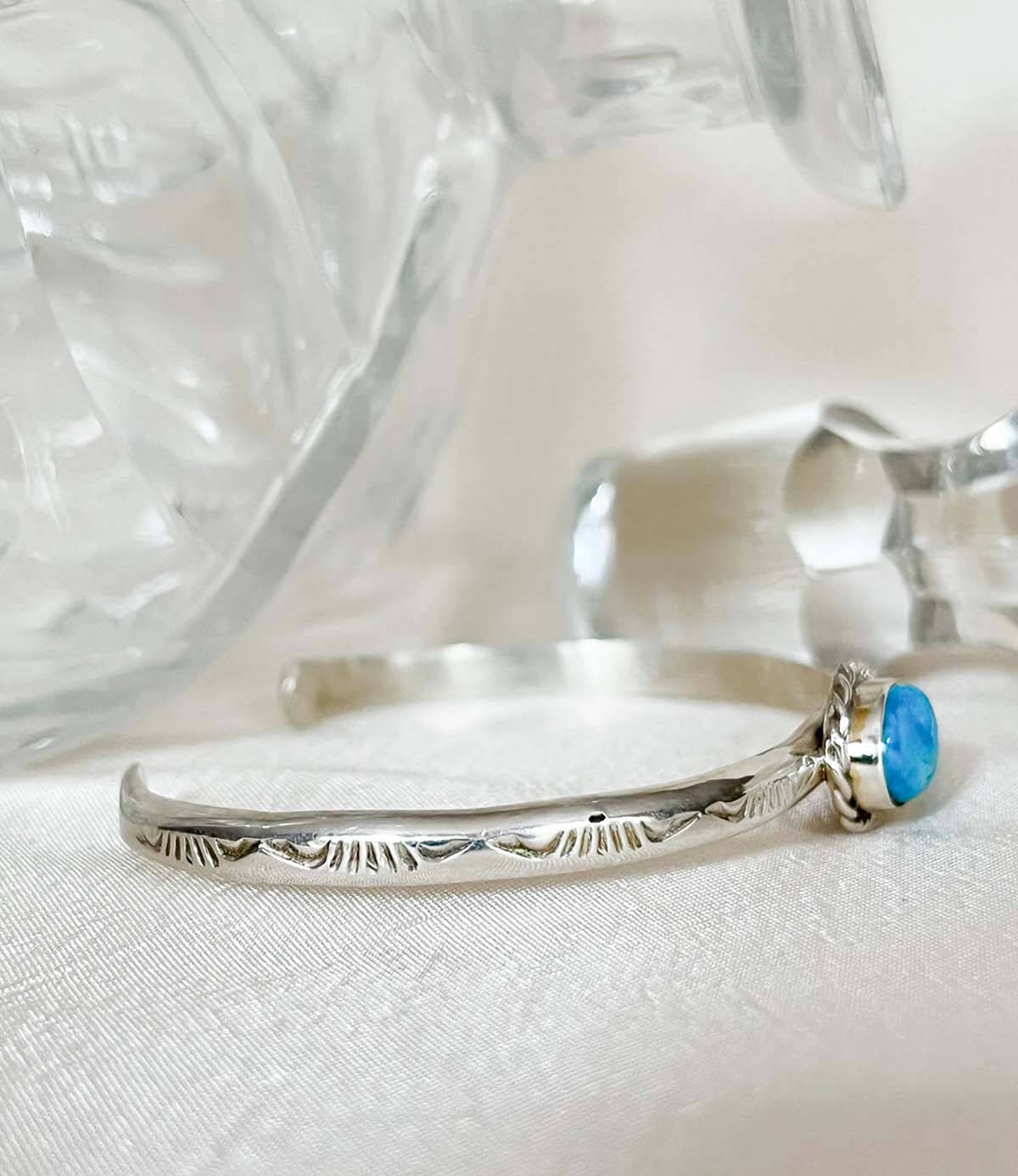 This MOANA turquoise bangle is carefully crafted by Navajo silversmith Anthony. It features 925 sterling silver, adorned with a oval-shaped turquoise stone, and is designed as a flexible bangle that can be easily shaped to your wrist.