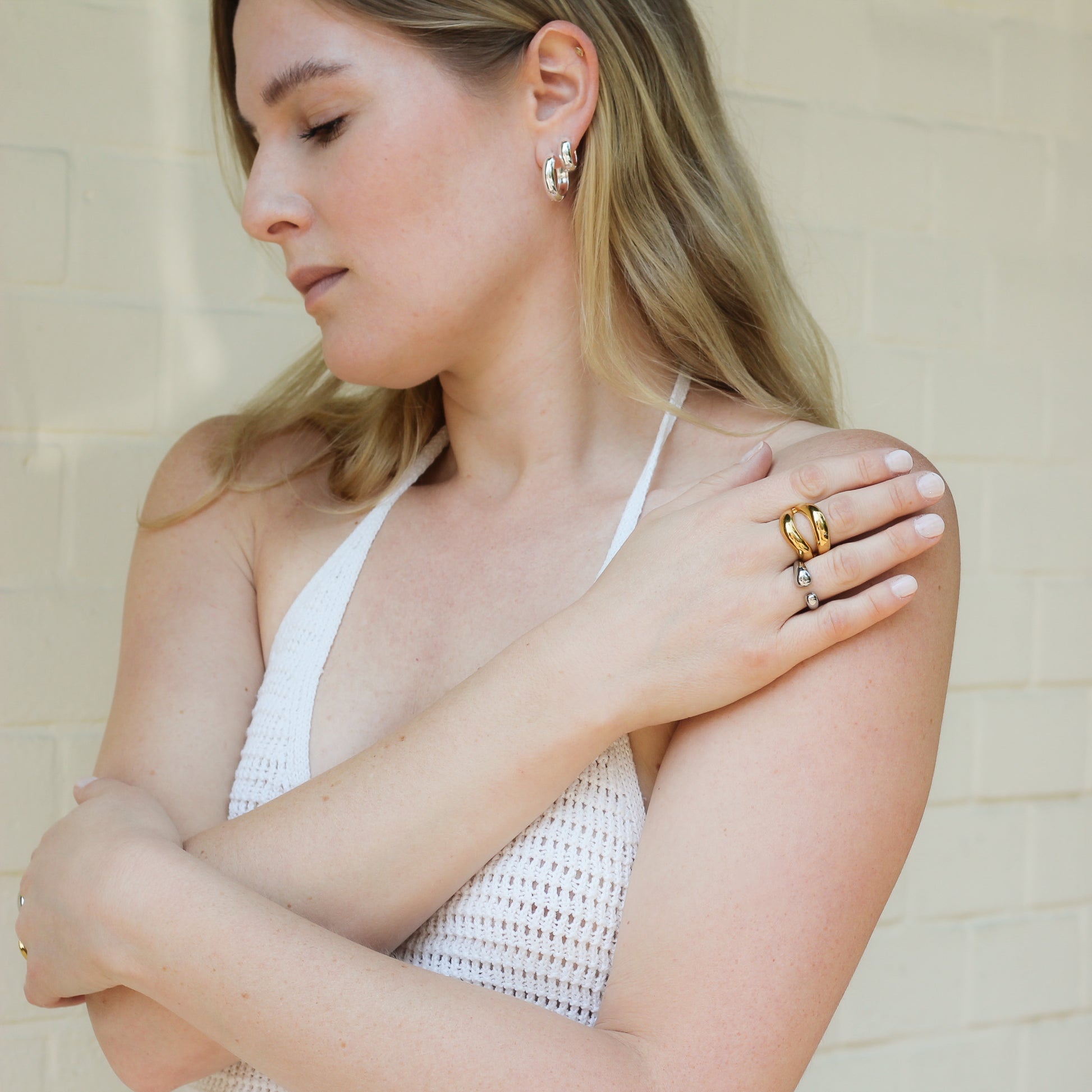 Our PAULA ring in gold is a bold essential for everyday wear. Crafted from durable Premium stainless steel, it is designed to withstand daily wear while maintaining its shine and elegance for any occasion.